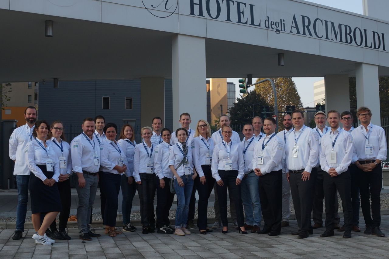 BONN, 31. Oktober 2018 - Regelmäßig zieht es den Arbeitskreis der Junioren im DTV für seine Tagungen ins Ausland. Mitte Oktober bot sich die Gelegenheit, die Textilpflegemesse EXPOdetergo in Mailand zu besuchen und in einem kompakten Format zahlreiche Zulieferer kennenzulernen und sich zu Themen wie der Energie- und Ressourcenschonung oder Prozessoptimierung auszutauschen. Neben fest eingeplanten Standbesuchen bei Sankosha, Laco, Multimatic, Foltex, Büfa und Zollner hatten die Tagungsteilnehmer auch Gelegenheit, noch einige Stunden „auf eigene Faust“ die Messe zu erkunden. Am Folgetag präsentierte die Firma Beirholm den interessierten Teilnehmern zudem seine Ansätze einer nachhaltigen Produktion und zeigte, dass Textilien mit einem hohen Polyesteranteil – welche damit besonders für den Textilservice interessant sind – trotzdem ein angenehmes „Baumwollgefühl“ beim Verbraucher erzeugen können.