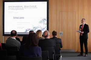 Das Texcare Forum bot die Möglichkeit, sich neben dem Besuch der Ausstellerstände noch zu wichtigen Themen der Branche auszutauschen. Das Vortragsprogramm startete mit Professor Lutz Vossebein von der Hochschule Niederrhein für Textil- und Bekleidungstechnik, der über „Karriere in der Textilindustrie: Aus- und Weiterbildungsmöglichkeiten in der Zukunft“ sprach.