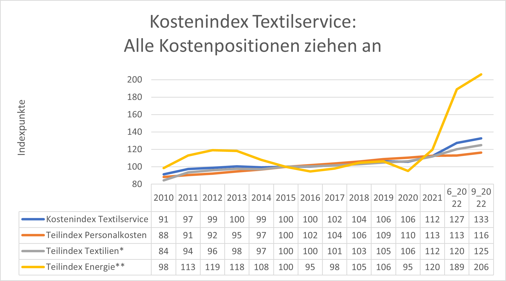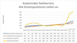 Berlin, 16.11.2022 – Die massiv gestiegenen Energie- und Rohstoffpreise lassen im Textilservice die Kosten merklich ansteigen. Der Kostenindex für den Textilservice ist im bisherigen Jahresverlauf 2022 um 21 Indexpunkte auf einen neuen historischen Höchststand von 133 gestiegen. Das ist ein gefährlich hoher Wert, weil er eine Kostenexplosion auf ein völlig neues Niveau darstellt und die Schnelligkeit des Anstiegs eine Dynamik zeigt, die für viele Betriebe nur schwer betriebswirtschaftlich darstellbar ist.