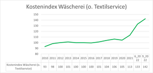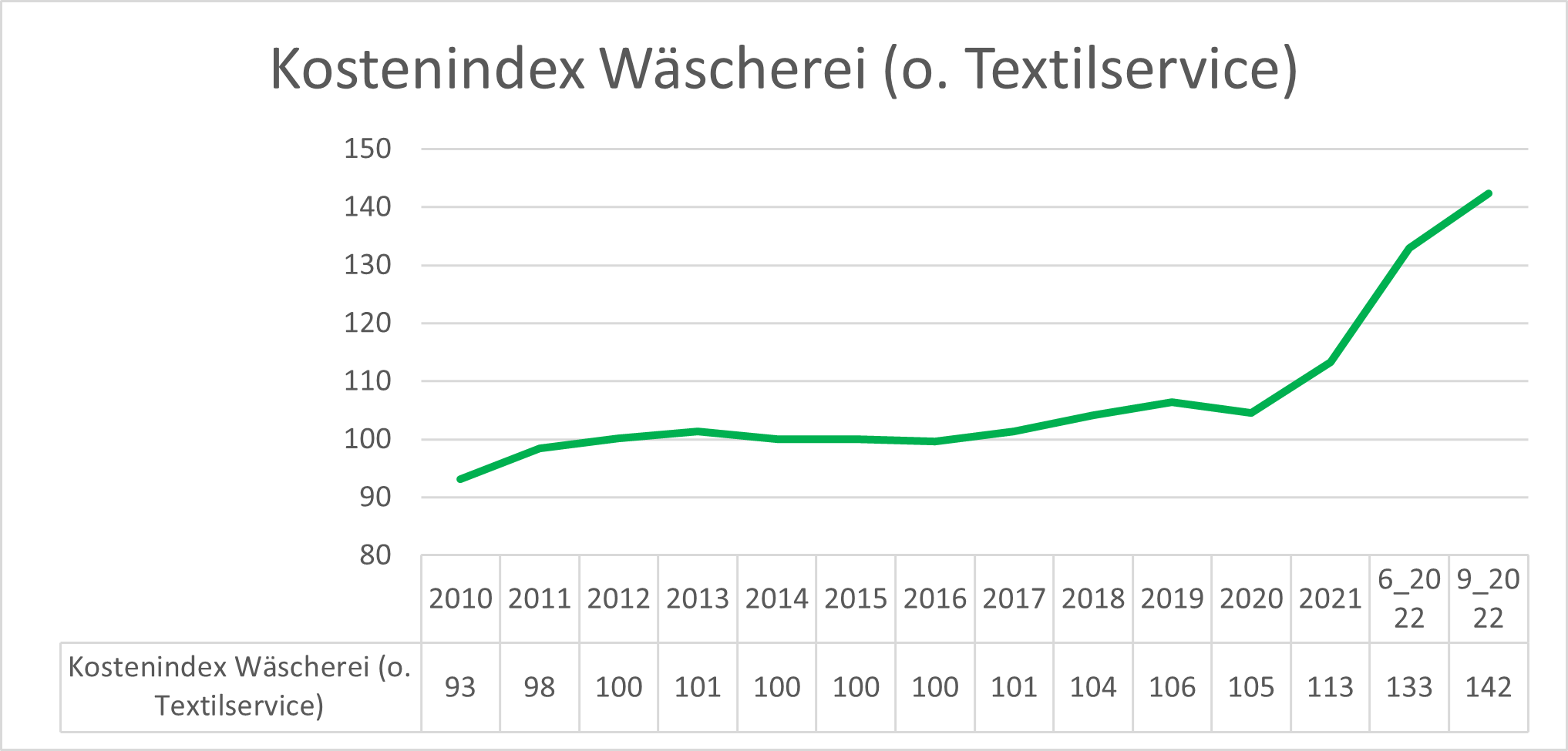 Erstmalig bietet der DTV zum dritten Quartal 2022 auch einen Kostenindex für Wäschereien ohne Textilservice an. Dieser Index steigt noch stärker auf 142 Indexpunkte. Grund dafür ist, dass in diesem Geschäftsmodell die Energiekosten ein sehr viel stärkeres Gewicht haben als im Textilservice bei dem mit dem Handling der Textilien ein großer zusätzlicher Kostenblock existiert, der sich in den letzten zwei Jahren weniger explosionsartig erhöht hat.