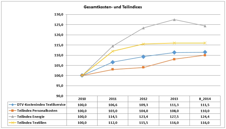 BONN, 10. März 2015 - Für die politische und geschäftliche Auseinandersetzung ist eine gesicherte Datenbasis, die die Kostenentwicklungen einer Branche präzise beschreibt und nachvollziehbar macht, von enormer Bedeutung. Nun konnte der erste DTV-eigene Kostenindex für Textilservice Unternehmen vorgestellt werden. Er soll den DTV-Mitgliedern bei der Bewertung durch Banken und Versicherungen oder bei Verhandlungen mit Kunden künftig ein wichtiges Hilfsmittel sein.
