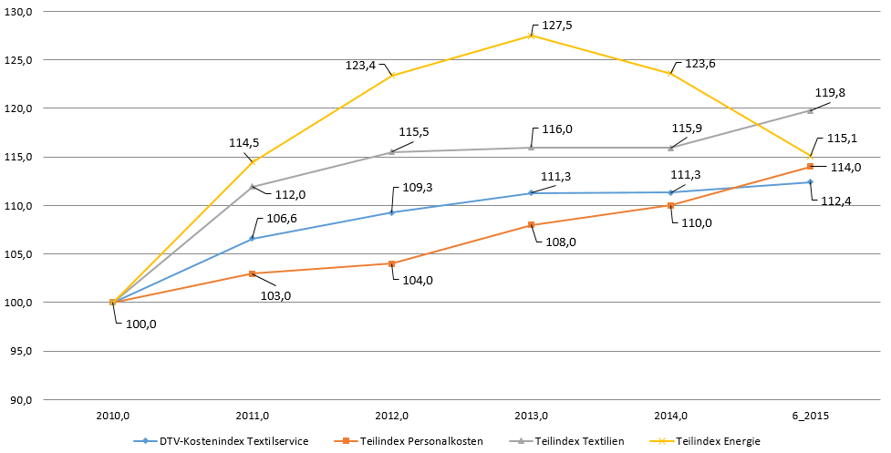 BONN, 26. Oktober 2015 - Im vergangenen Jahr wurde erstmals der Kostenindex für den Textilservice präsentiert, der die Entwicklung der Gesamtkosten und ihrer Komponenten für die Textilservice-Unternehmen in Deutschland präzise beschreibt und nachvollziehbar macht. Der aktualisierte Kostenindex zeigt nun, dass die Gesamtkosten im Textilservice zwischen 2010 und Mitte 2015 um rund 12,5 Prozent gestiegen sind.